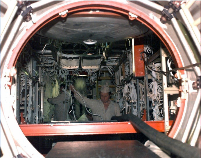 This image shows the interior of the Zvezda module during its construction in 1997 and looks towards the aft of the module as viewed from the Transfer Compartment.