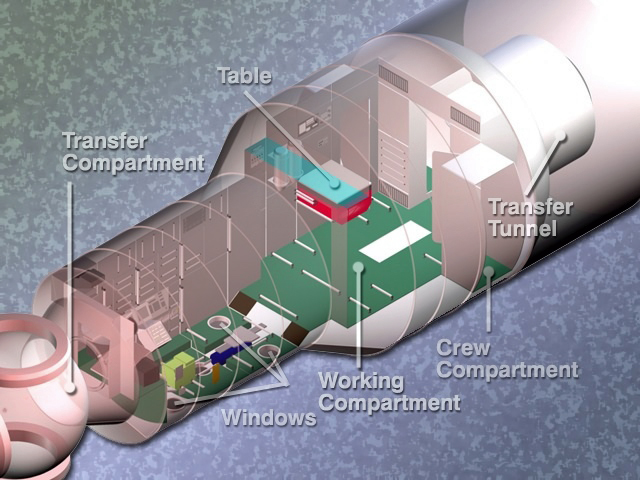This composite cutaway of the interior of Zvezda reveals some of the configuration awaiting the early resident crews. Zvezda provided the early living quarters and key systems and was the major Russian contribution to the fledgling ISS.