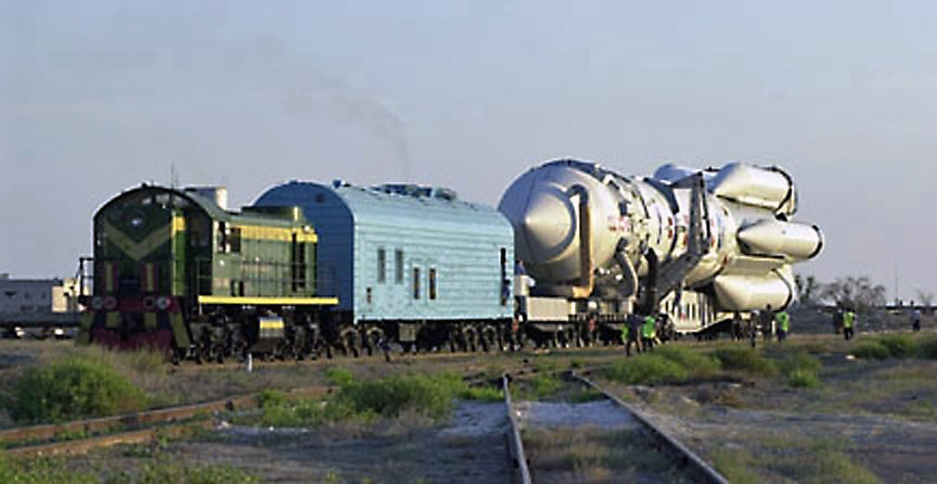 The Proton rocket housing the Zvezda Module is transported to the launch pad by rail on 5 July 2000.