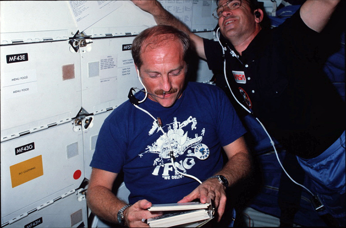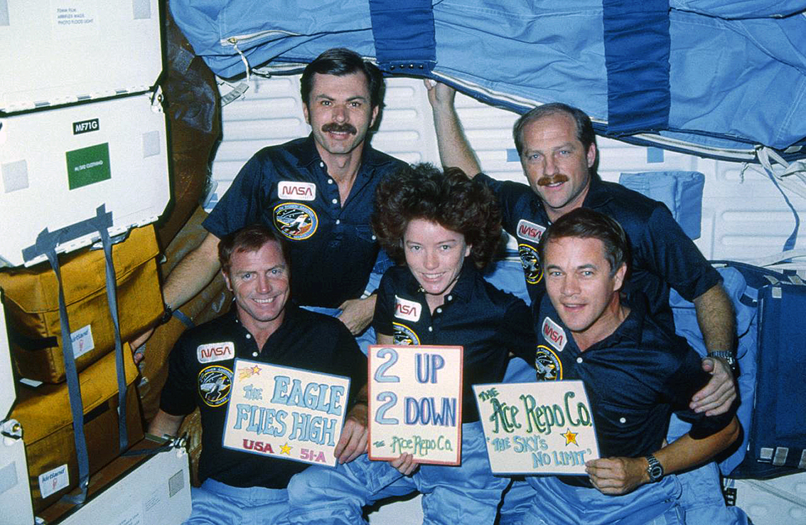 Shuttle mission training; (3 Aug) reassigned as CDR to STS-51A (satellite deployment/retrieval mission); Shuttle mission training; (8-16 Nov) flew as CDR STS-51A, Discovery (7 days 23 hrs 44 min). |
