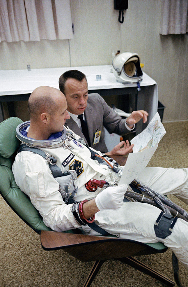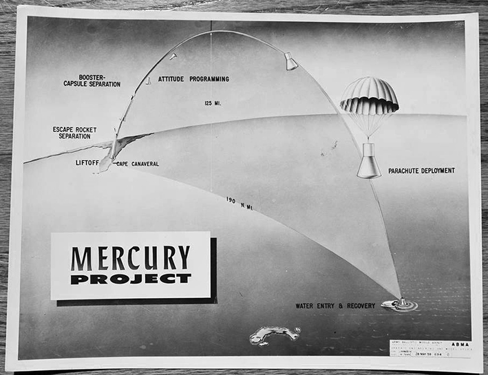 Mercury training; (21 Feb) identified but not made public as prime Pilot (PLT) for the first sub-orbital mission; Mercury training; (2 May) publicly identified as the first American to launch to space after first launch attempt was scrubbed due to weather; (5 May) flew as PLT Mercury-Redstone 3 (MR-3) Freedom 7; sub-orbital mission (15 min 28 sec); FIRST AMERICAN IN SPACE; (Jul) Capcom MR-4 (Grissom). |