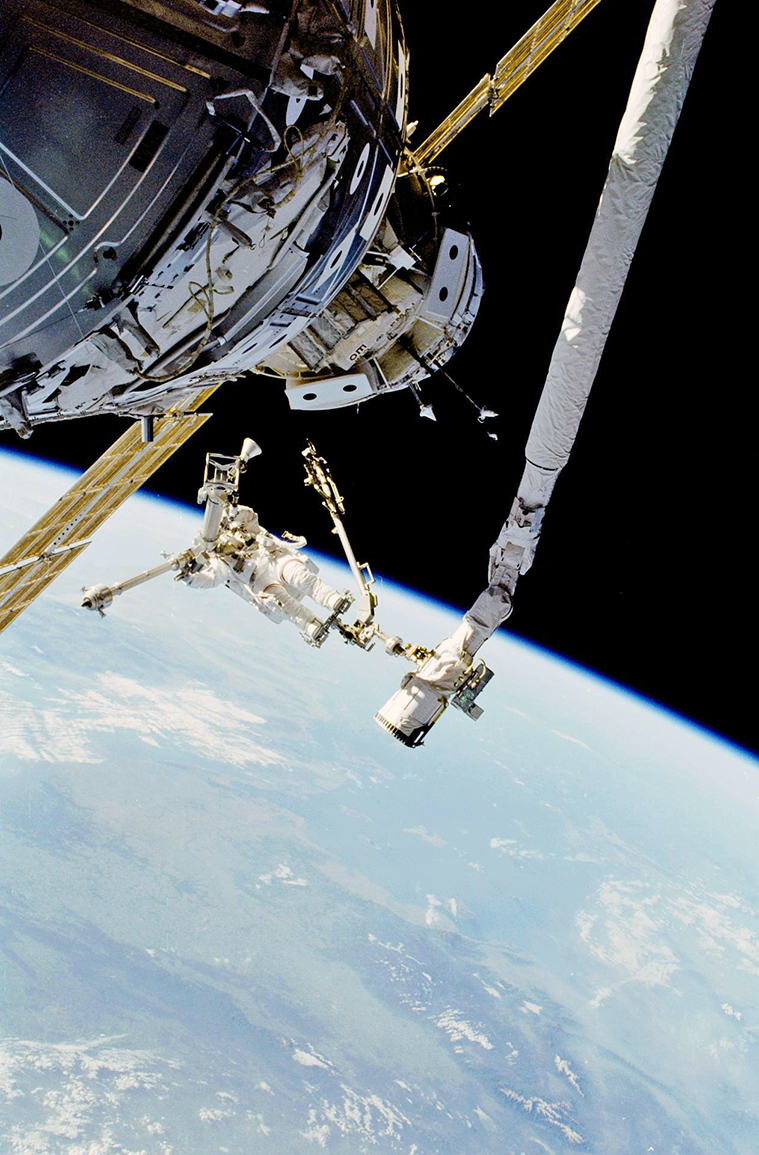 Perched on the RMS arm over 300 km above the Agean Sea, MS Tammy Jernigan handles part of the crane that she and fellow EVA astronaut Dan Barry would install on the ISS during STS-96. The pair also added toolbags, handrails and foot restraints to the outside of the station.