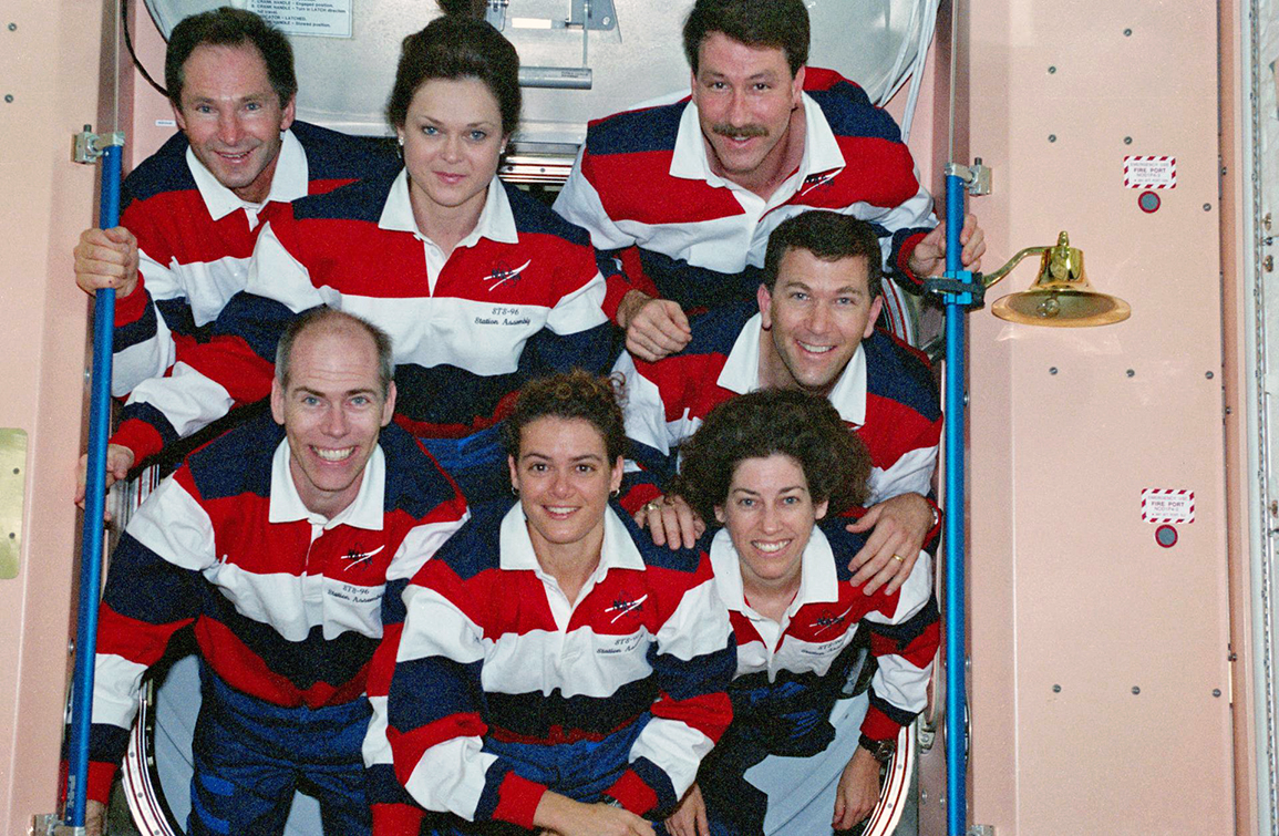The crew of STS-96, the first Shuttle re-supply mission and the first to dock with the station. (Clockwise from top left) MS Valery Tokarev, MS Tammy Jernigan, CDR Kent Rominger, PLT Rick Husband, MS Ellen Ochoa, MS Julie Payette and MS Dan Barry.