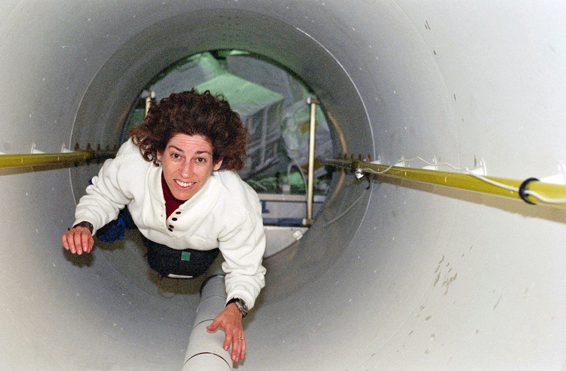 MS Ellen Ochoa floats through the tunnel connecting STS-96 to the ISS. The crew transferred over 1,600 kg of supplies to the station during the mission, some of which can be seen behind Ochoa in this image.