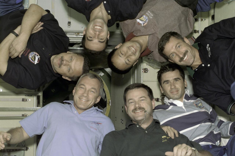 The STS-106 crew poses aboard the ISS for the traditional in-flight crew portrait. (Clockwise from bottom left) Terrence Wilcutt (pale shirt, CDR), Boris Morukov (MS), Richard Mastracchio (MS), Ed Lu (MS), Dan Burbank (MS), Yuri Malenchenko (MS) and Scott Altman (PLT)