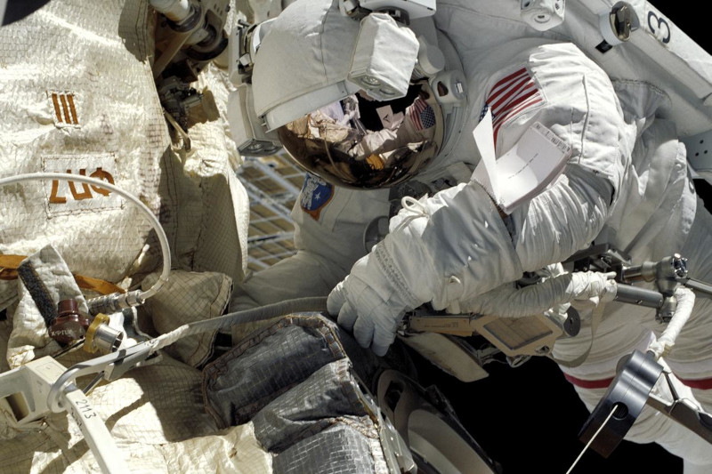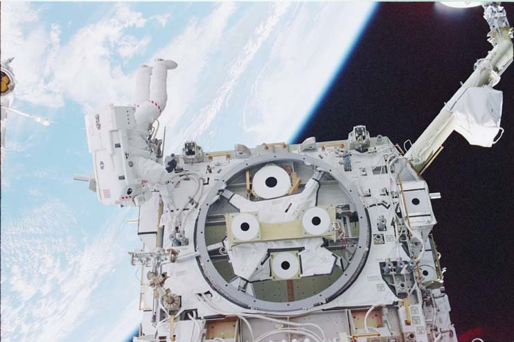 MS Michael Lopez-Alegria is seen working on the Z-1 truss and Node 1 Unity module of the ISS on one of the EVAs performed during STS-92. The astronauts worked outside the station in alternating pairs (Chiao and McArthur, Lopez-Alegria and Wisoff) outside the station for over 27 hours across four spacewalks.