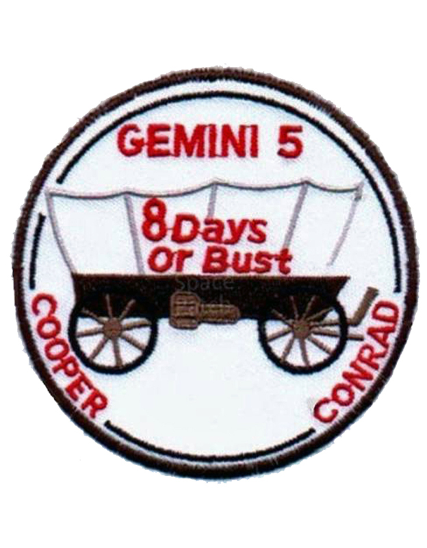 Gemini 5 became the first U.S. mission to have an official crew emblem. Featuring an image of a 19th century "Old West" covered wagon, whose slogan was "California or Bust", the Gemini 5 crew amended the motto to "Eight Days or Bust". When the design was proposed, the crew were told to cover up the slogan in case they "busted" before reaching the planned eight days.