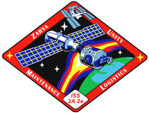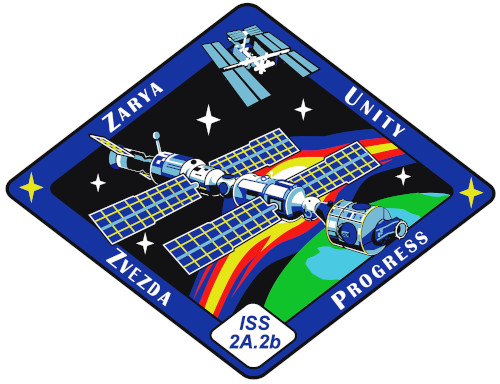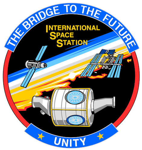 In addition to the mission emblems, each of the Shuttle flights to ISS during Expedition Zero also had its own ISS mission emblem. (From top left) STS-88, STS-96, STS-101, STS-106 and STS-92.