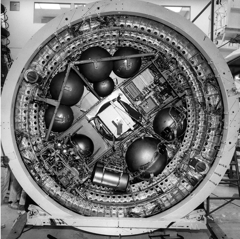 This image shows the fuel cells that would be used for the first time on the Gemini 5 mission, housed in the Adapter Module of the spacecraft. Issues with the fuel cells would curtail many of the activities on the mission and make it a tougher test for the two crewmen.